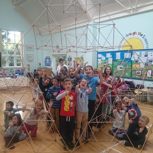 Use teamwork and engineering skills to build a giant tetrahedron. The modular system allows every child to have their own part in making this 4 metre high structure. It’s so big, we can fit the whole class inside it for a photo (carefully!).